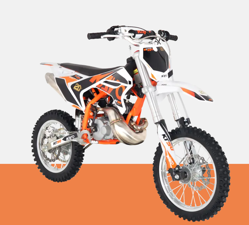 KAYO KT50 to dwusuwowy dirt bike o pojemności 50 cm3 , który posiada dużą moc i usprawnienia ułatwiające naukę jazdy kilkulatkowi. Automatyczna skrzynia biegów, 2 rodzaje rozrusznika (elektryczny i nożny), regulowana kierownica – to atrybuty, które pomogą młodemu riderowi w nauce opanowania jazdy na motocyklu. KAYO KT50 to opcja dla dzieci, które ukończyły 7. rok życia, które są na tyle wysokie, żeby poradzić sobie z pojazdem z kołami o średnicy 14 i 12 cali. Ten dirt bike waży tylko 50 kg, co ułatwia dziecku manewrowanie i utrzymanie równowagi np. przy wchodzeniu w zakręt. KAYO KT50 rozbudzi pasję i zaspokoi sportowe ambicje młodego ridera.